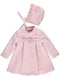 Casaco rosa com pelo nas golas e punhos, adornado com laços nos bolsos