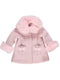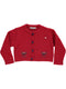 Casaco de malha azulão, adornado com laços e botões rosa.