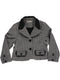 Casaco de malha preto, adornado com laços e botões rosa forte.