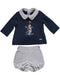 Conjunto de bebé composto por camisa com detalhe de bordado e smocks e calção azul.