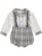 Calções de tartan vermelho com suspensórios, combinados com a gola e punhos da camisa..