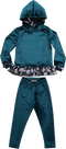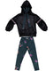 Conjunto de menina de hoodie rosa com faixa preta nas mangas e calças pretas estampadas a combinar com os cordões do capuz.