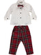 Conjunto de menino com calças tartan vermelho a combinar com o papillon e punhos da camisa.