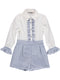 Macacão chanel rosa e branco com folhos rosa nas mangas e peito.