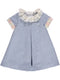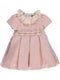 Vestido chanel rosa com corte redondo no peito e detalhe de renda, botões decorativos e gola bordada.