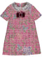 Vestido chanel rosa com pregas macho, detalhe de renda na gola e franjas na cinta.