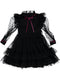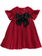 Vestido de veludo marinho com tecido plissado e detalhe de vivo em contraste vermelho.
