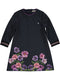 Vestido pérola com tecido exclusivo ilustrado com flores, punhos com elástico em lurex e detalhe lilás no decote.