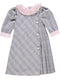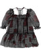 Vestido preto com padrão de piet-de-poule e rosas vermelhas, detalhe de tule vermelho na gola que aperta com laço.