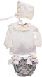 Conjunto de bebé azul bebé com casaco, blusa e saia. Casaco com capuz com detalhe de forro em xadrez. Blusa com detalhe de tira trabalhada e aperta na costa com sistema de molas. Saia em xadrez com alça, detalhe de laço e pregas e cinto em elástico.