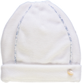 Descrição: Gorro branco laminado com detalhe de vivo estampado azul
