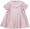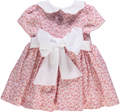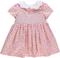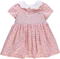 Vestido de bebé rosa florido com smocks, gola peter-pan e laço branco nas costas.