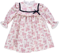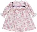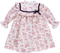Vestido de bebé rosa florido com folhos no peito e renda nas mangas e decote.