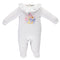 ‘Babygrow’ branco com estampado colorido no centro com flores e carinho de bebé. Simples, tem uma gola redonda simples, com renda rosa à volta, confecionada em tecido com textura piqué, que se repete nos pés. Muito confortável, aperta com molas.