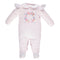 ‘Babygrow’ branco com estampado colorido no centro com cupcake, flores e laço. Simples, tem uma gola redonda em folho com detalhe de ponto aberto na borda. Muito confortável, aperta com molas.