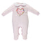 ‘Babygrow’ rosa para menina bebé com estampado colorido na frente, com flores e borboletas, em algodão orgânico. A gola redonda é confecionada com tecido leve branco, com bordado de flores rosa. Tecido que se repete nos ombros em pequenos folhos e nos pés. Muito confortável, aperta com molas.