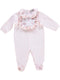 Babygrow de menina rosa e cinzento com gola e folhos.