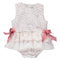 Body de menina bebé de alças em branco com padrão em tons verdes de linda paisagem, de algodão macio. O body tem uma saia rodada incorporada confecionado com tecido leve rosa às riscas brancas. Na cintura dois laços em cada um dos lados em rosa, feitos do mesmo tecido da saia que também se repete nos folhos das alças. O body é forrado para conforto do bebé e aperta atrás e no fundo com molas.