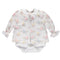Body de menina bebé em malha macia de algodão com túnica incorporada. A túnica branca com padrão floral vermelho, tem folhos e renda floral branca nos punhos das mangas compridas, e uma prega invertida no centro. A gola é redonda branca com a borda folhada, feita com o tecido principal. Aperta atrás e nas costas com molas.