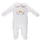 Body de menina bebé em malha macia de algodão com túnica incorporada. A túnica branca com padrão colorido com pintinhas, flores e carrinhos de bebé, tem folhos e renda floral branca nos punhos das mangas compridas, e uma prega invertida no centro. A gola é redonda branca com a borda folhada, feita com o tecido principal. Aperta atrás e nas costas com molas.
