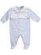 Babygrow azul com frente às riscas, duas golas com vivo.