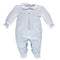 Body para menino bebé em manga curta azul em algodão. O tecido principal é azul às riscas brancas com silhuetas de peixes, que se pode encontrar nos calões, mangas curtas e gola. A cintura é marcada por uma fita azul-marinho num tecido com textura piqué. O peito é branco com estampado de âncora, boia e peixes na frente. Aperta atrás e no meio dos calções com molas.