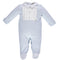Body de menino bebé branco com riscas amarelas em linho. A parte de cima, estilo camisa, é branca com botões falsos na frente amarelos. A gola simples com acabamento em bico é confecionada com tecido às riscas amarelas e brancas, tecido que se repete na borda das mangas e nos calções incorporados, com detalhe de prega invertida. A cinta tem uma tira em toda a volta, com detalhe de botões amarelos nos lados. Forrado, para maior conforto do bebé, aperta atrás e em baixo com molas.