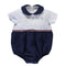 Babygrow de algodão cinzento com papillon aos quadrados. Parte superior com peito trabalhado em nervuras, com botões aplicados. Molas para apertar nas costas e pernas.