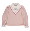 Esta adorável camisola em malha azul marinho combina com graciosidade a elegância de uma camisa. Um toque de luxo é adicionado com detalhes em veludo rosa, tornando-a uma peça única e encantadora.