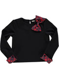 Camisola preta com laço e punhos em xadrez vermelho.
