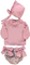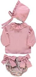 Conjunto de bebé rosa com touca , blusa e cueca. Touca com detalhe de franzido com aperto em nó através de tira. Blusa com detalhe de folho na gola de manga comprida e aperta com sistema de molas nas costas. Cuecas com detalhe de franzido e de dois laços frontais.