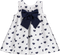 Vestido azul com estampa de corações e folho na gola e mangas. Detalhe às ondas na cinta.