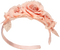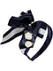 Bandolete forrada com veludo azul-marinho com um grande laço composto por fita de veludo azul-marinho e fita às riscas em azul, vermelho e verde. No centro, um botão em forma de camafeu. Uma toque de estilo.
