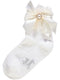 Meia branca com flor rosa.