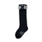 Meias azul marinho com renda branca e laço de veludo amarelo