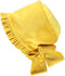 Touca de veludo vermelha com aplicação de folhos e renda à volta. A touca é presa por um laço do mesmo tecido.