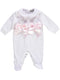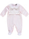 Babygrow rosa com gola peter-pan, pregas no peito e folho.