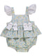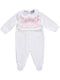 Babygrow rosa com gola peter-pan, pregas no peito e folho.