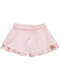 Calças rosa com tecido bordado de flores.