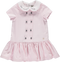 Casaco de menina-bebé em fibra de lã azul-marinho de menina-bebé com fita rosa no fundo e grande laço azul de veludo atrás, O casaco aperta na frente com botões em pérola azuis,