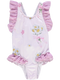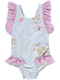 Fato de banho azul com motivos florais, folhos e laço nas costas.