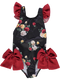 Fato de banho vermelho com motivos de flores, com folhos e laços.