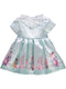 Vestido azul com folho na gola, estampa de barra com Milkshakes e laço nas costas.