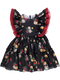 Vestido azul marinho com pregas, laços e detalhes em fita de riscas vermelhas e brancas.