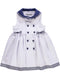 Vestido azul marinho sem manga, com gola marinheiro e botões vermelhos, fita de riscas para contraste e laços aplicados.