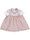 Vestido rosa em linha "A", com estampa de corações, sem mangas com renda no forro e laços nas costas.