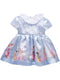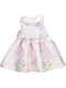 Vestido verde com folho na gola, estampa de barra com Milkshakes e laço nas costas.
