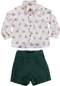 Conjunto de calças com camisa de manga comprida e laço. Calça ao xadrez com bolsos e de cinto elástico nas costas, aperta na frente com trespasse e botão. Camisa de manga comprida branca com punho , aperta na frente com sistema de botões. Laço estampado em xadrez