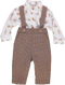 Conjunto de calções com camisa de manga comprida. Camisa com botões forrados e contraste de vivos na gola e no punho da blusa. Aperta com sistema de molas na costa .Calções com alças cruzadas , detalhe de cinto com elástico e aperta na frente com forrados.