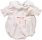 Body menina estampado floral azul, gola com renda à volta e detalhes franzidos nos ombros e nas mangas. Laço frontal, perneiras com elástico e molas de pressão nos fundos e nas costas.